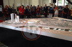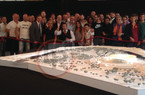 11.09 - Prende il via l'evento. Pallotta, Parnasi, gli architetti Liebskin e Kipar, Zanzi, Viola e Pannes vengono introdotti da Matteo Vespasiani, volto di Roma Tv. I partecipanti si schierano alle spalle del plastico del progetto per le foto di rito, prima di prendere posto in sala per l'inizio della conferenza.