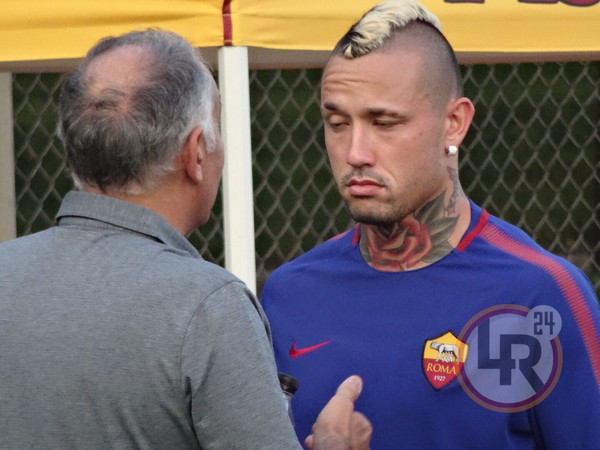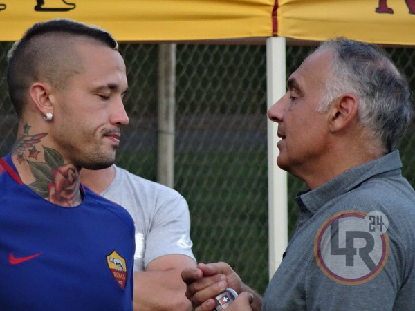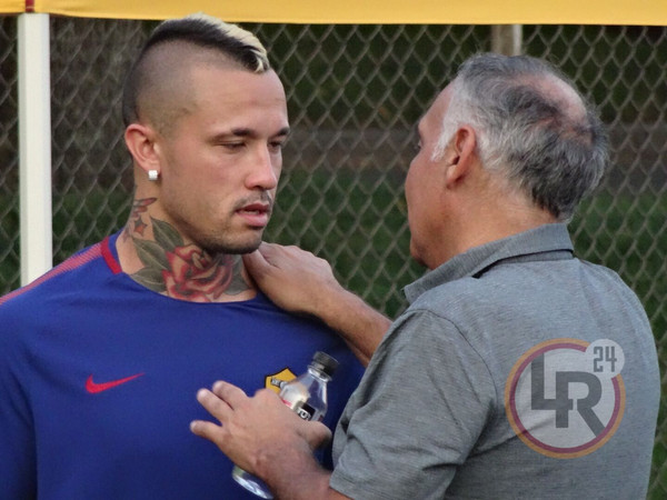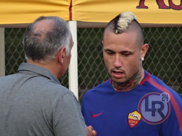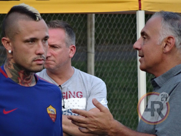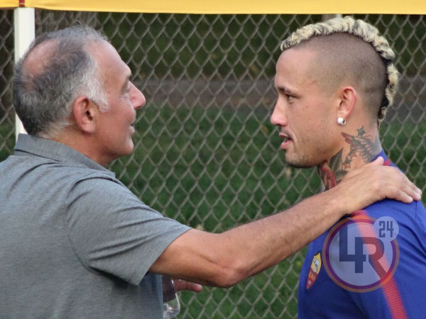 DA BOSTON DAMIANO FRULLINI - 10 minuti di fitto colloquio tra il presidente della Roma James Pallotta e Radja Nainggolan al termine della seduta pomeridiana di allenamento. Il numero uno giallorosso si è intrattenuto con il belga in un lungo e animato scambio di opinioni che si è concluso con un bell'abbraccio che lascia presagire una fine positiva nella trattativa che porta al rinnovo del centrocampista